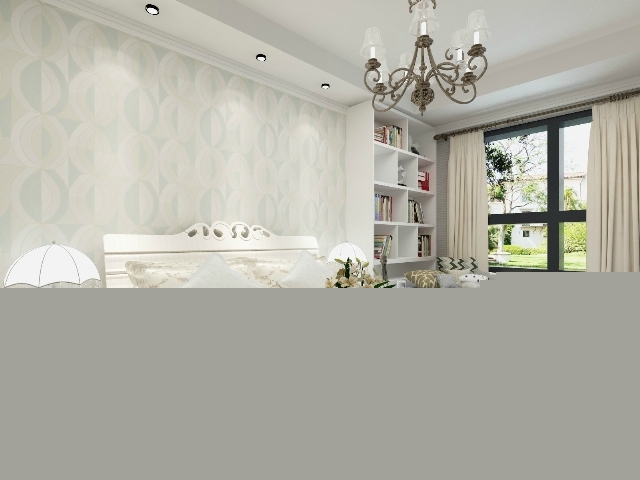 淡綠色花紋壁紙?jiān)黾恿藭r尚感,優(yōu)美的花紋,鐵藝的吊燈,增加了臥室的古典氣息。