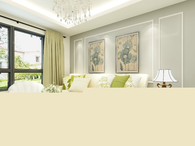 白色的沙發(fā)搭配綠色的碎花抱枕,加上同色系的窗簾,灰色的背景墻搭配大幅的裝飾畫,表現(xiàn)出明亮清新的居室。