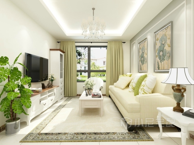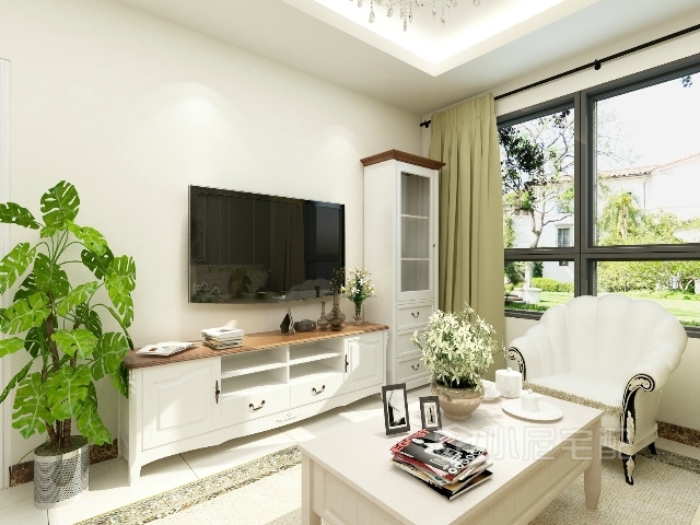 白色田園風(fēng)格的電視柜組合,綠色的植物增加整個空間的活力。