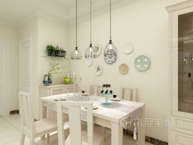 鐵藝長線吊燈,白色橡木的餐桌椅,表現(xiàn)出悠閑,舒暢,自然的田園生活情趣。