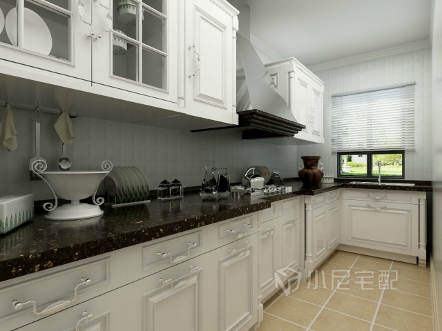 白色的櫥柜,淡藍(lán)色方格墻磚,黃色地磚,彰顯著輕松,隨性的生活態(tài)度