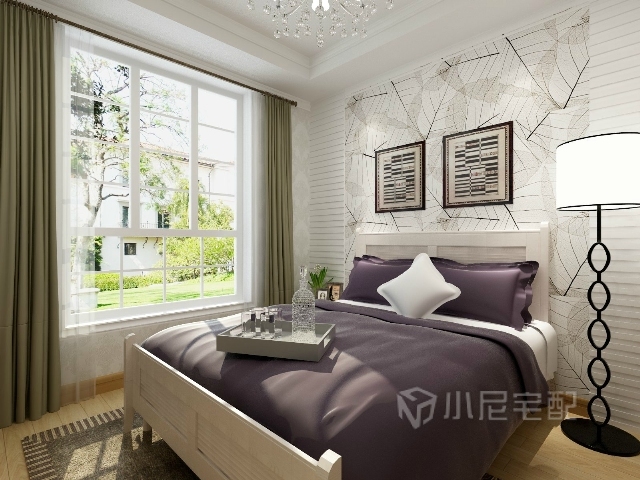 床頭墻選用葉子圖案的裝飾墻搭配草綠色的窗簾,增加自然的清爽的情調(diào)。
