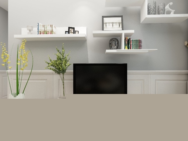 電視背景也沒(méi)多做修飾,放置幾個(gè)擱板增加儲(chǔ)物功能即可