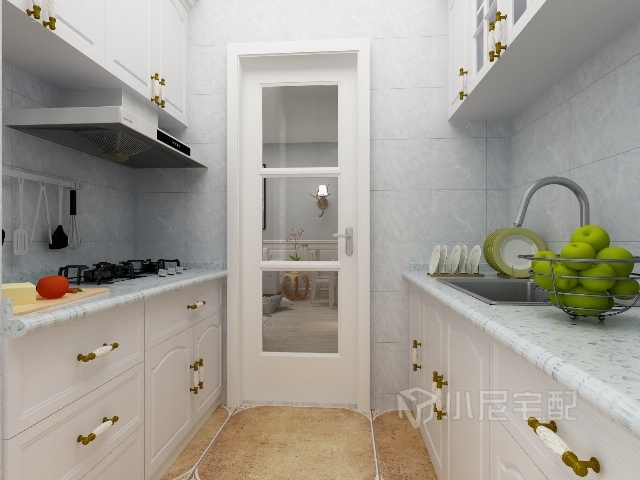 廚房的墻磚和臺(tái)面都采用了淡藍(lán)色的設(shè)計(jì),清新自然