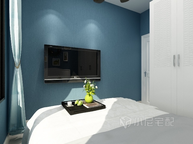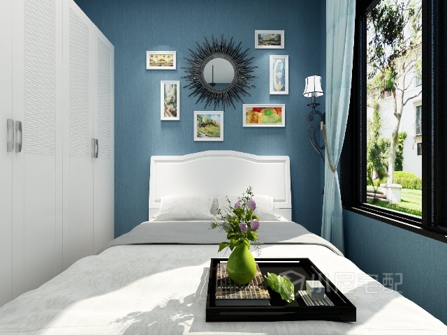 從窗戶(hù)看進(jìn)來(lái),湖藍(lán)色的墻面背景很有美式的特色
