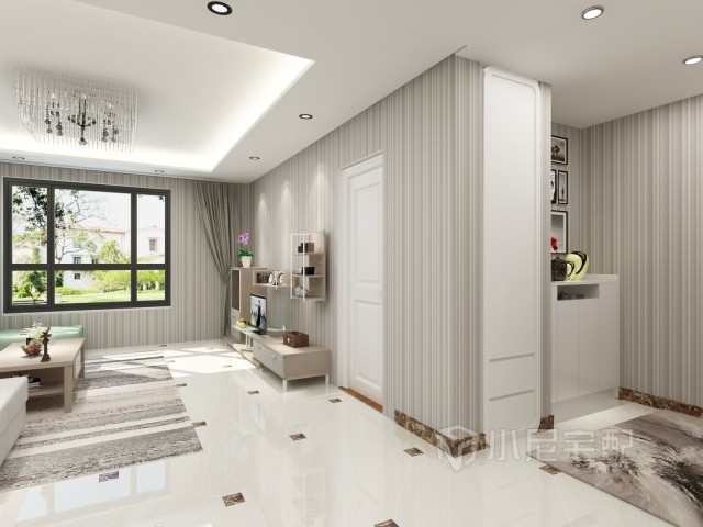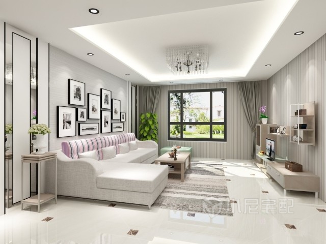沙發(fā)背景墻采用現(xiàn)代化鏡面元素,整個(gè)空間顯得很開闊