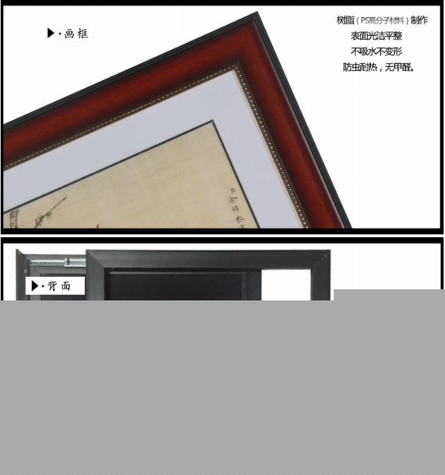 樹脂畫框,仿實(shí)木紋理,并塑有優(yōu)美的弧線,拼接嚴(yán)密自然,內(nèi)邊配金色花式線條,更顯品位。