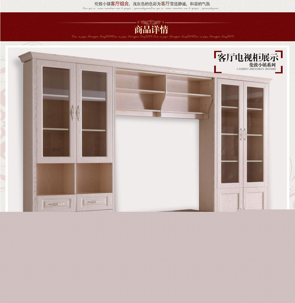 | 細節(jié)描述 | 客廳柜干凈利落的線型,古典的紋理將英倫色彩完美演繹加上通透的玻璃門,勾勒出家具的風韻與格調;茶幾造型新穎獨特,切角的茶幾腿使茶幾更顯線條明塊,造型優(yōu)美;間廳柜在起到分割的作用的同時,其文雅的線條和時尚的造型也起到了裝飾作用;沙發(fā)是根據人體學設計,扶手端正,坐感舒適,不易疲乏,支腳采用優(yōu)質五金,配膠墊,防劃傷地板。 |