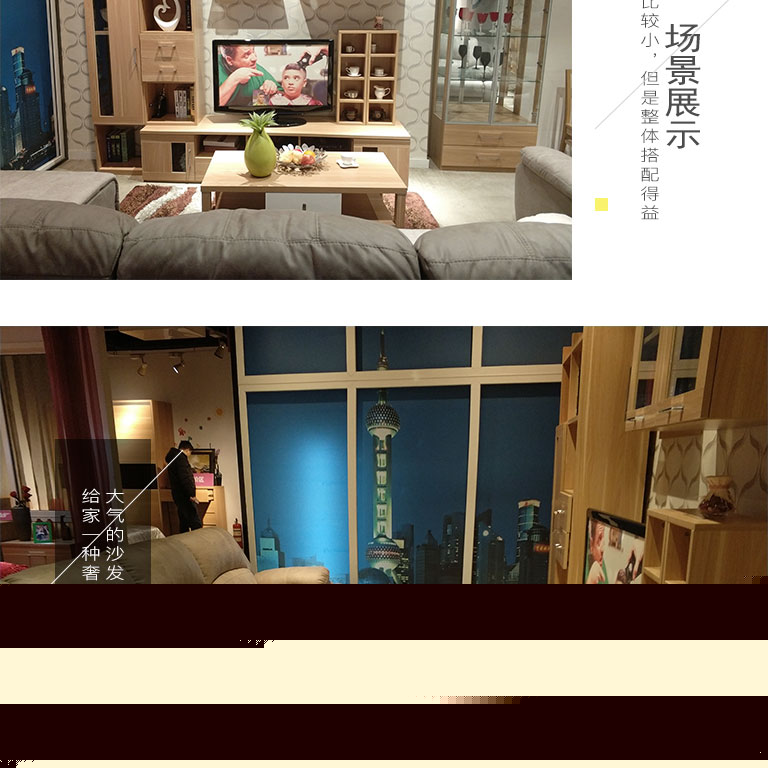 | 細節(jié)描述 | 電視柜可隨意搭配,讓空間擁有更多可能,大氣的沙發(fā),給家一種奢華感。 |