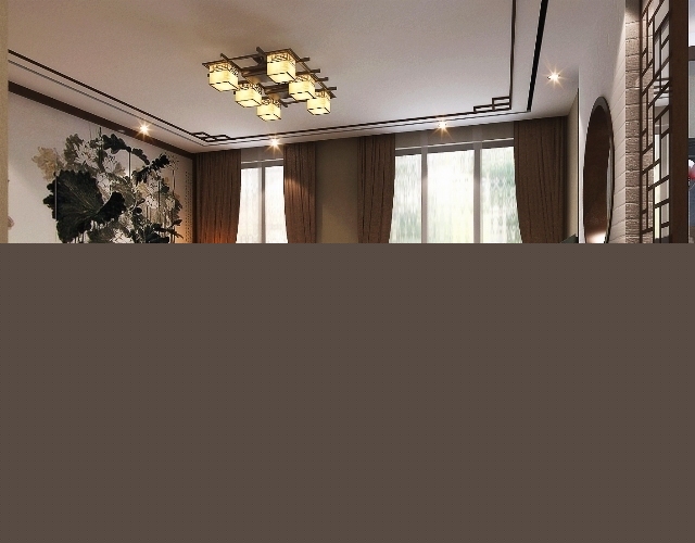 其中中式元素尤為突出,以暗紅、琉璃黃、長(zhǎng)城灰、玉脂白、水墨黑和木原色來(lái)打造新中式的氣氛,暗紅色的原木茶幾,同樣色彩的沙發(fā)底座,原木色的電視柜以及經(jīng)典的中式座椅,沙發(fā)背景以荷花的水墨畫來(lái)裝飾,中式的木工隔斷,都是以中國(guó)傳統(tǒng)古典文化為支撐的。茶具、雕塑、佛頭像這些都帶有濃郁的東方之美。