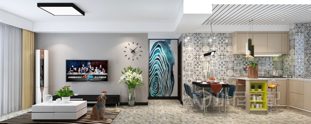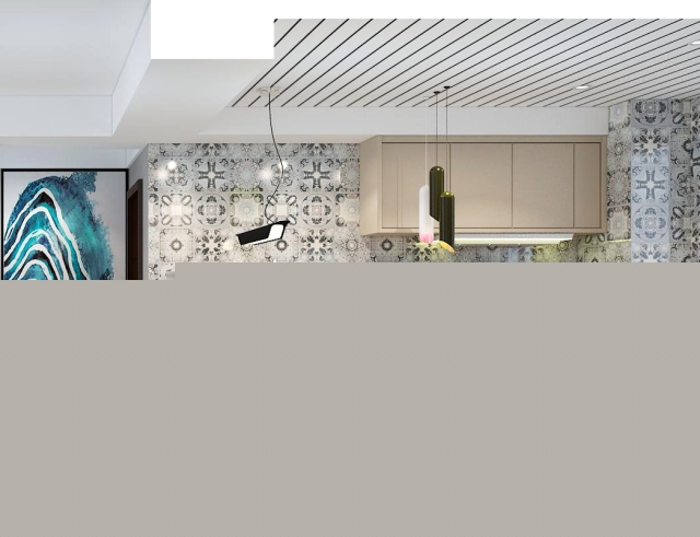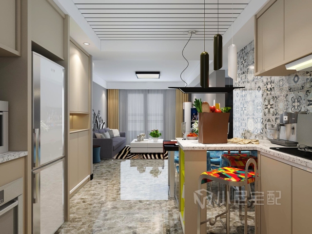 由于原始戶型廚房較小,所以經(jīng)過(guò)墻體拆改,將餐廳廚房,門(mén)廳搭配到一起,整體顏色搭配采用小尼地平線系列,與花磚形成強(qiáng)烈對(duì)比,使整個(gè)空間更溫馨,更出彩