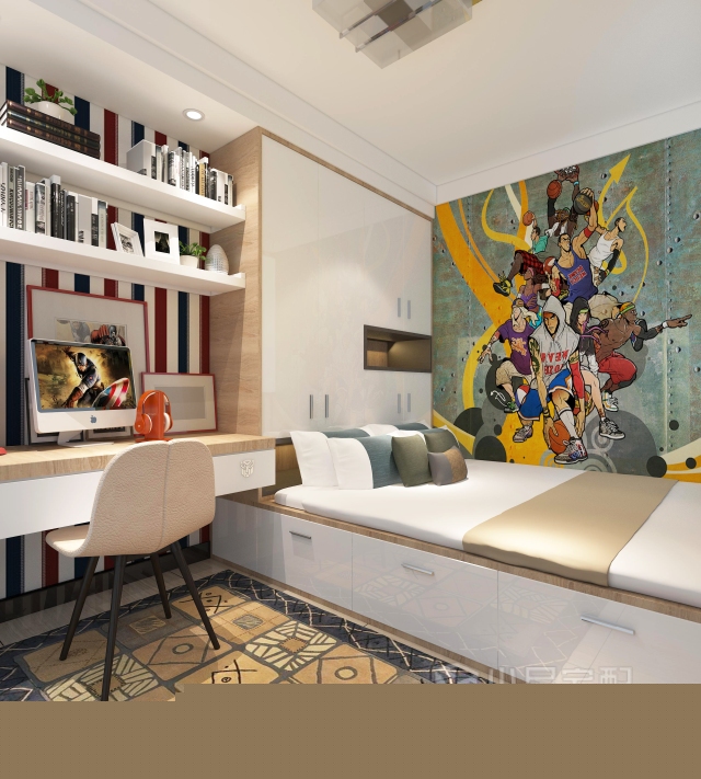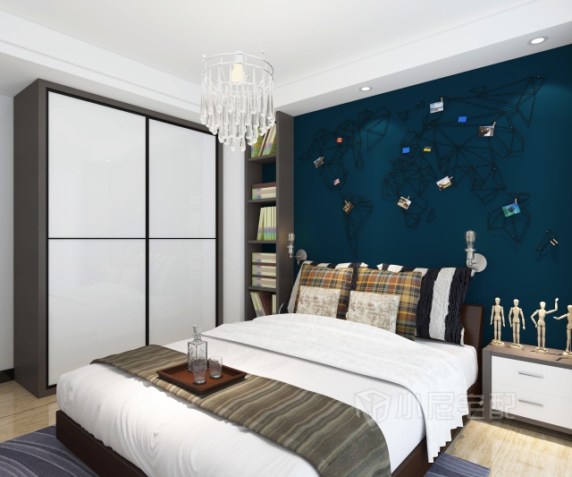 進(jìn)入臥室,背景墻采用深色壁紙,搭配淺色吊頂,亮光烤漆白衣柜,運(yùn)用顏色的對(duì)比,使空間更加清爽