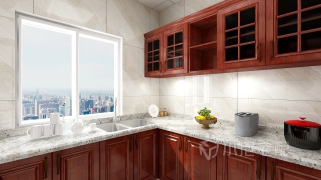 廚房空間比較大 可以2至3人來準(zhǔn)備可口的飯菜 玻璃的吊柜和開放格更容易拿到你想要的餐具或調(diào)料 整體凸顯出層次感