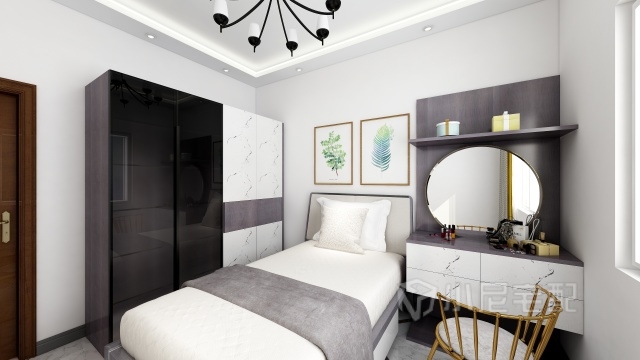 次臥 青年房衣柜功能區(qū)特別分明 也同樣配備了玻璃門扇 簡(jiǎn)潔時(shí)尚 配備的梳妝臺(tái)就很容易看出是一個(gè)美少女的房間啦呵呵