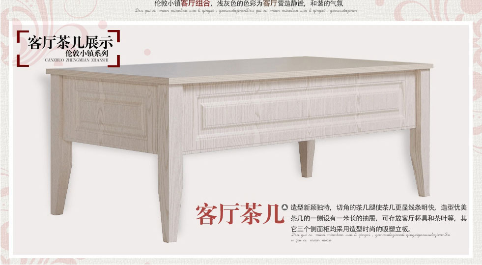 | 細節(jié)描述 | 客廳柜干凈利落的線型,古典的紋理將英倫色彩完美演繹加上通透的玻璃門,勾勒出家具的風韻與格調;茶幾造型新穎獨特,切角的茶幾腿使茶幾更顯線條明塊,造型優(yōu)美;間廳柜在起到分割的作用的同時,其文雅的線條和時尚的造型也起到了裝飾作用;沙發(fā)是根據人體學設計,扶手端正,坐感舒適,不易疲乏,支腳采用優(yōu)質五金,配膠墊,防劃傷地板。 |