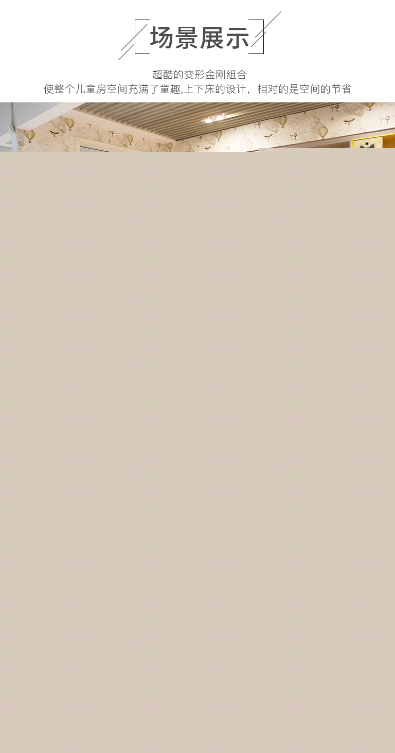 | 細(xì)節(jié)描述 | 超酷的變形金剛組合,使整個(gè)兒童房空間充滿了童趣,在裝飾空間的同時(shí)也起到了收納的作用。轉(zhuǎn)角書(shū)桌滿足了小朋友的學(xué)習(xí)空間,弧形臺(tái)面不僅美觀,又避免了小孩的磕磕碰碰。坐臺(tái)和書(shū)桌結(jié)合在一起,家長(zhǎng)可以在旁邊陪同學(xué)習(xí),還可以與孩子互動(dòng)玩樂(lè)。 |