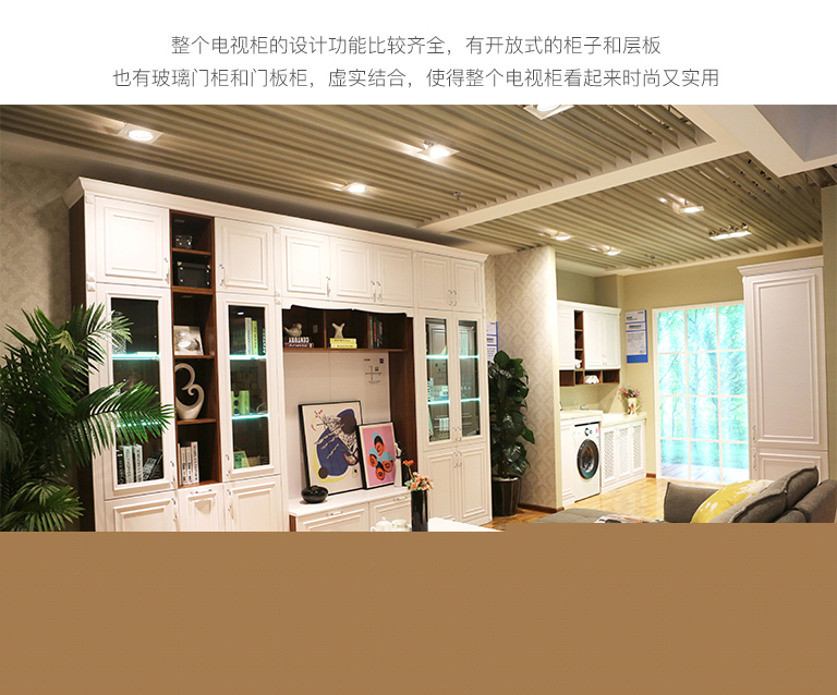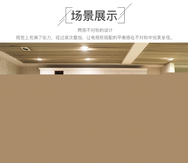 | 細(xì)節(jié)描述 | 兩側(cè)不對(duì)稱的設(shè)計(jì),視覺(jué)上充滿了張力,經(jīng)過(guò)層次疊加,讓電視柜搭配的平衡感在不對(duì)稱中完美呈現(xiàn)。整個(gè)電視柜的設(shè)計(jì)功能比較齊全,有開(kāi)放式的柜子和層板,也有玻璃門柜和門板柜,虛實(shí)結(jié)合,使得整個(gè)電視柜看起來(lái)時(shí)尚又實(shí)用。開(kāi)放柜中可以放一些CD、相框和喜歡的飾品,玻璃門的柜子可以放一些??吹臅?shū)籍,門板柜一般收納一些不常用的雜物,現(xiàn)代感十足。 |